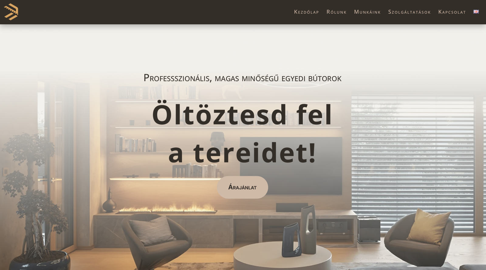 Modern, többnyelvű, mobilbarát weboldal egyedi bútorokat gyártó vállalkozás számára. Erős vizuális jelenlét és bizalomépítő struktúra.