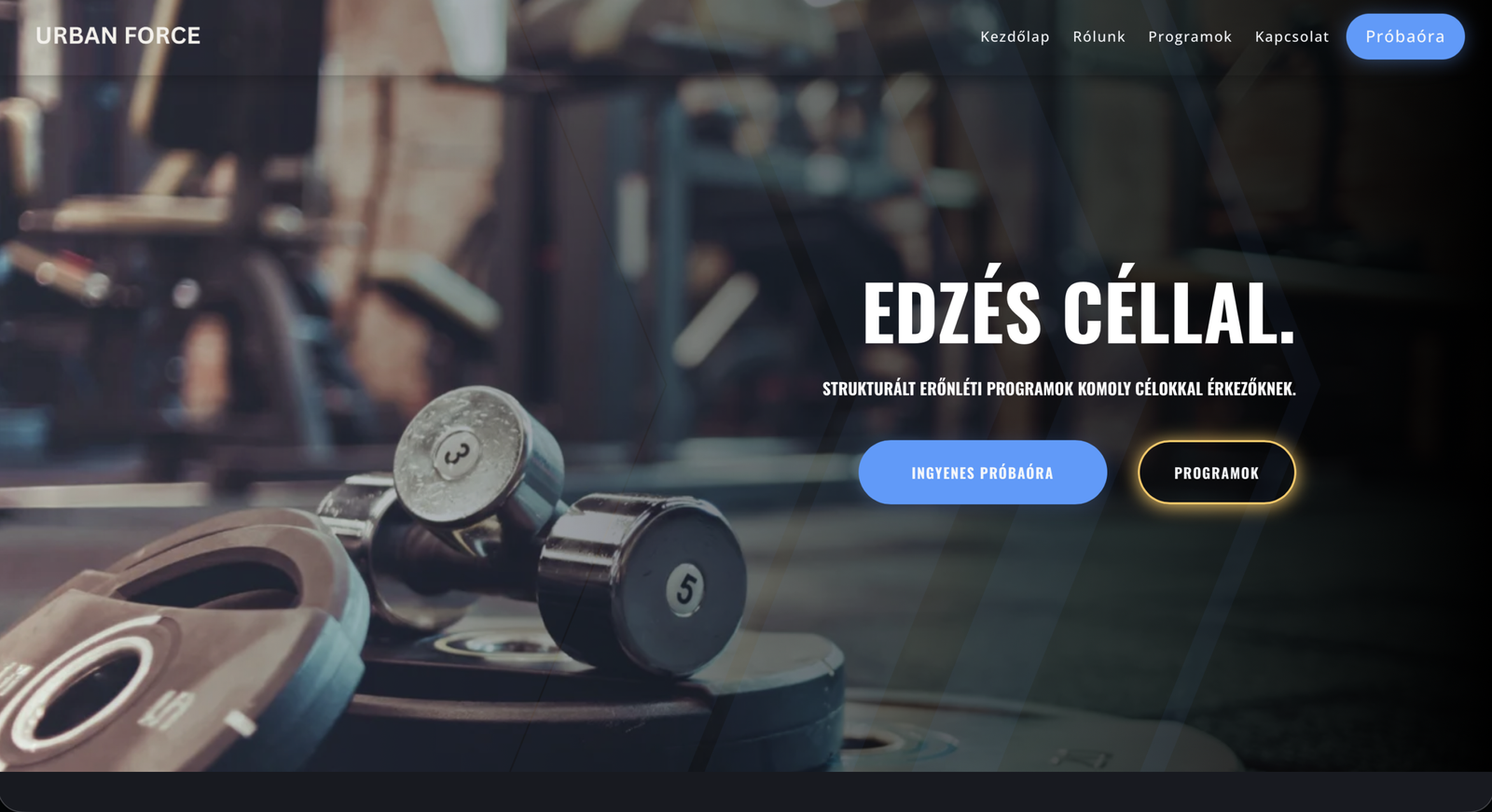 Letisztult, sötét vizuális világ, erős CTA szekciók, árkártyás rendszer, ügyfélvélemények és strukturált tartalomfelépítés – kifejezetten fitness termek és személyi edzők számára tervezve.