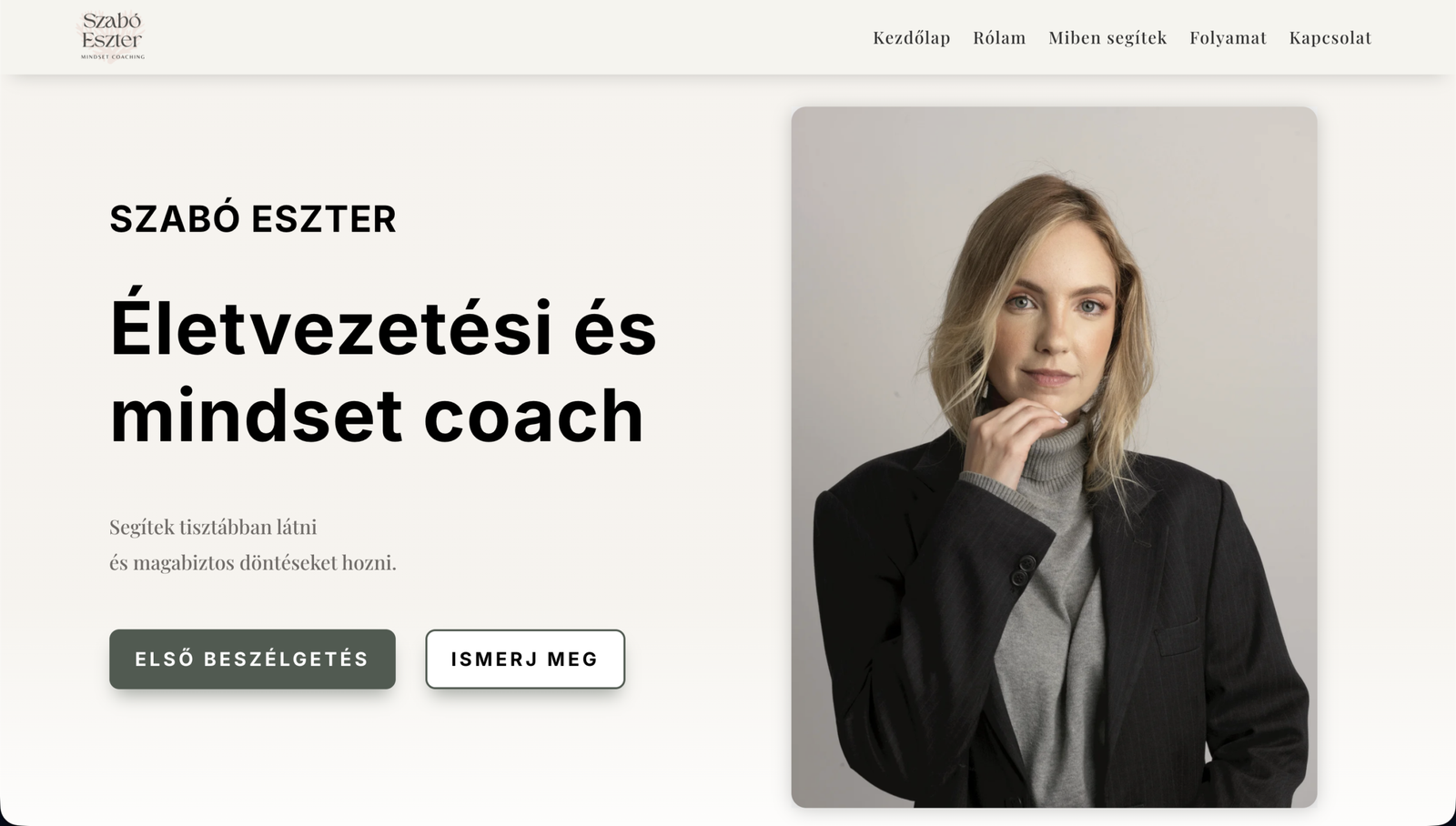Egy elegáns, minimalista coach weboldal koncepciója. Editorial tipográfia, visszafogott animációk és tiszta tartalmi struktúra a nyugodt, bizalomépítő felhasználói élményért.
