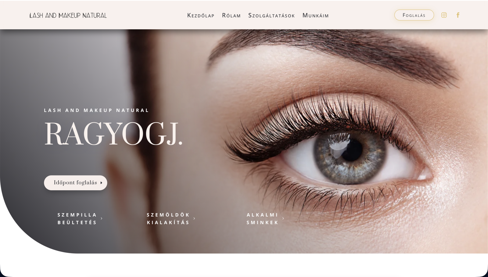 Elegáns, nőies hangulatú weboldal smink- és szempilla stylist számára. Letisztult design, vizuális portfólió és egyszerű online időpontfoglalás – mobilra optimalizálva.